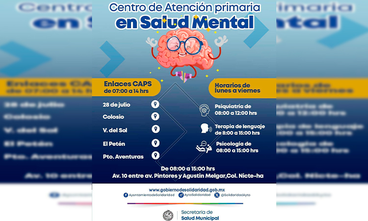Playa del Carmen, Solidaridad a 31 de mayo del 2024.- La salud mental es muy importante, por lo que se invita a la ciudadanía en general acudir para su atención, en cualquiera de los 5 CAPS de atención general, en el CAPSM (Centro de Atención Primaria en Salud Mental) ubicado en la colonia Nicte-ha, o bien al Sistema para el Desarrollo Integral de la Familia (DIF). Centros dotados con profesionales para brindar la atención necesaria y ayudar a quienes lo requieran.