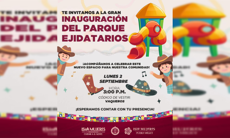 Isla Mujeres, Quintana Roo, 31 de agosto de 2024.- Con el firme compromiso de generar bienestar y continuar con el engrandecimiento de Ciudad Mujeres, la Presidenta Municipal de Isla Mujeres, Atenea Gómez Ricalde, inaugurará el parque infantil “Ejidatarios” este lunes 2 de septiembre a las 15:00 horas, para que las niñas y niños tengan un nuevo espacio digno y seguro en el que puedan ser felices, convivir y pasar momentos memorables.