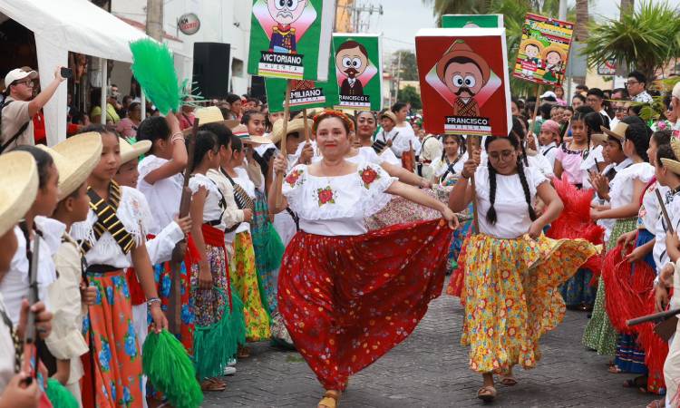 Los contingentes desfilaron con orgullo, representando a diversas instituciones educativas y deportivas, desde el nivel básico hasta el superior. Entre los grupos destacados estuvieron el equipo de cachibol de la Coordinación del Adulto Mayor del Sistema para el Desarrollo Integral de la Familia (DIF) Isla Mujeres, las escuelas primarias “Andrés Quintana Roo”, “César Mendoza Santana” y “Julio Sauri Espinoza”, así como la secundaria técnica “Benito Juárez” y el Colegio de Bachilleres.