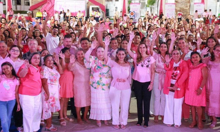 La Presidenta Municipal, acompañada de mujeres sobrevivientes del cáncer de mama y de familias isleñas, encabezó la ceremonia que recordó la importancia de la detección temprana con el mensaje “Tócate, para que no te toque”.