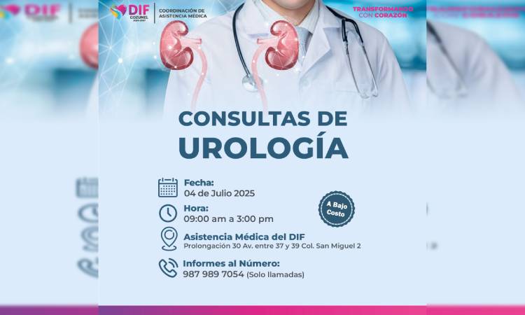Cozumel, Quintana Roo, a 30 de junio de 2025.– Con el firme compromiso de seguir acercando servicios médicos especializados a quienes más lo necesitan, el Sistema DIF Cozumel, que preside Diana Sosa Blanco, ofrecerá consultas de urología a bajo costo este viernes 4 de julio, en las instalaciones de la Coordinación de Asistencia Médica, ubicadas en la Prolongación 30 Avenida, entre 37 y 39, colonia San Miguel 2.