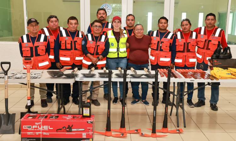 Por lo anterior, se hizo entrega de una moto sierra, 8 machetes, 7 palas, 8 rastrillos, 14 impermeables, dos bombas de agua, 10 pares de guantes de uso rudo, 2 carretillas, 4 picos, 144 pares de guantes y 6 pares de botas.