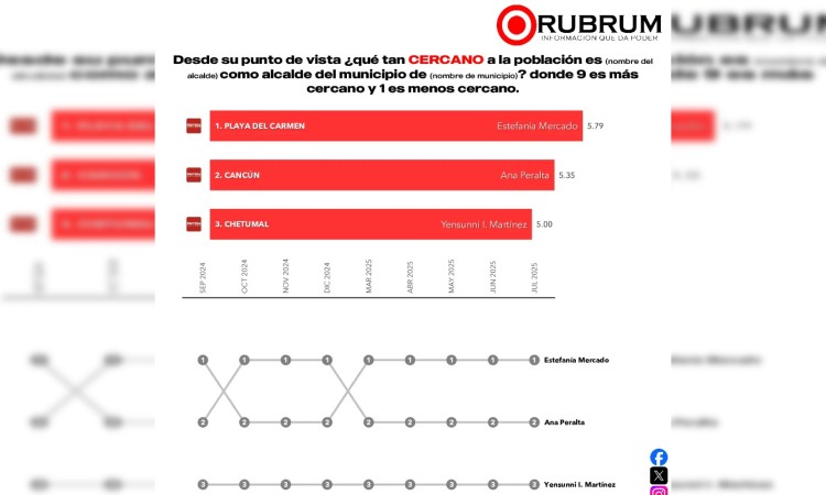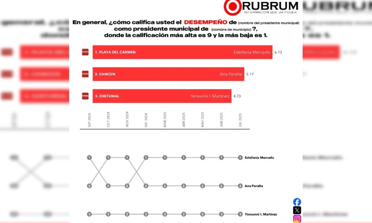 Playa del Carmen, Quintana Roo, 15 de julio de 2025.– La presidenta municipal de Playa del Carmen, Estefanía Mercado, lidera nuevamente la aprobación ciudadana en Quintana Roo, al posicionarse como la mejor evaluada en cuatro de los principales indicadores de desempeño gubernamental, de acuerdo con la más reciente encuesta de Rubrum, realizada entre el 1 y 5 de julio de 2025.