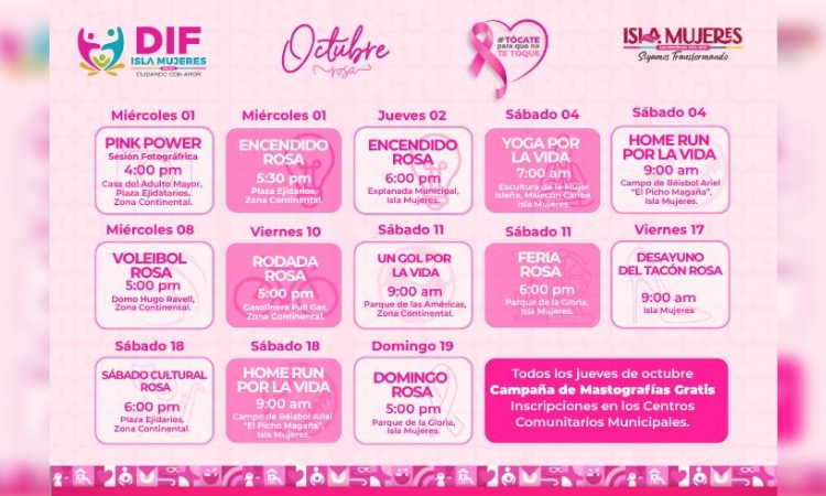 Isla Mujeres, Quintana Roo a 02 de octubre de 2025.- El Gobierno Municipal que encabeza la alcaldesa Atenea Gómez Ricalde, a través del Sistema para el Desarrollo Integral de la Familia (DIF) Isla Mujeres, anunció una nutrida agenda de actividades en el marco del Mes Rosa, como parte de la Campaña “Tócate para que no te toque”, que busca sensibilizar a la comunidad isleña sobre la importancia que tiene la detección oportuna del cáncer de mama.