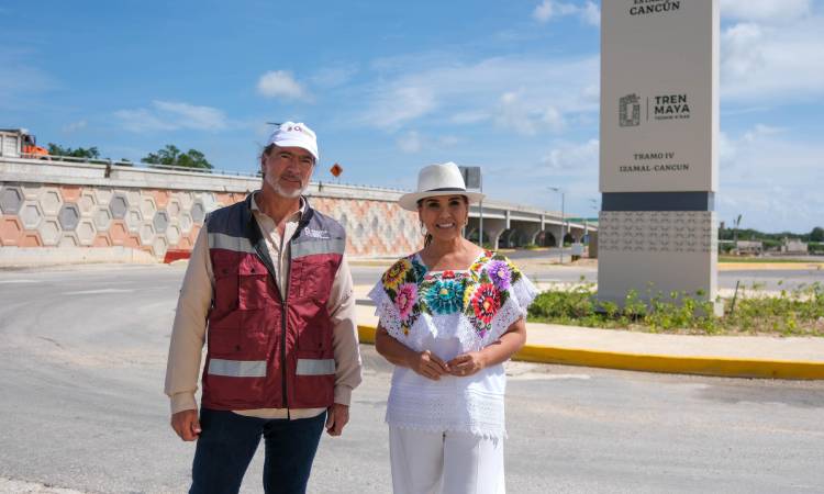 Mara Lezama recorrió la zona de obras, en donde dio a conocer que en breve las terminales del aeropuerto internacional de Cancún estarán interconectadas mediante vehículos eléctricos con la estación del Tren, utilizando este puente que es vital para el acceso a la estación.