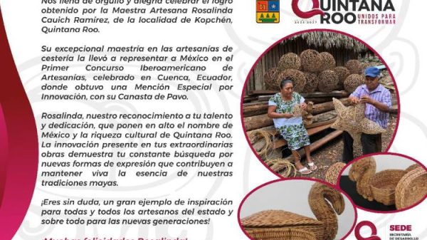 Rosalinda Cauich Ramírez obtuvo Mención Especial por Innovación en técnica de cestería. Fue una de las seleccionadas, de 96 postulaciones, para participar en este...
