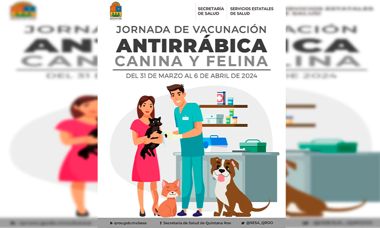 La Secretaría de Salud Quintana Roo ha dado a conocer que del domingo 31 de marzo al 6 de abril, se realizará la Jornada de Vacunación Antirrábica Canina y Felina 2024 una campaña que se realiza de manera anual como medida de control y prevención con la aplicación de más de 125 mil dosis.